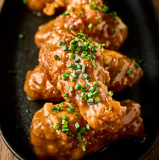 Alitas de pollo al estilo coreano bañadas en salsa fusión de barbacoa con mango y topping