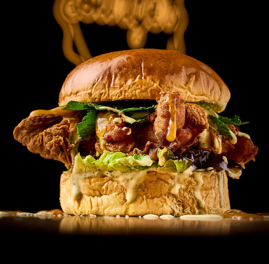 Smash burger, queso scamorza ahumado, guanciale, crema de yema de huevo y