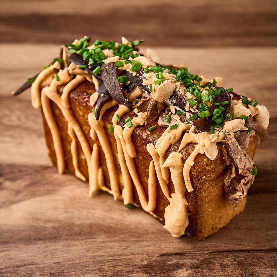 Brioche de pollo desmigado sazonado con mole mexicano, guacamole y pico de gallo.