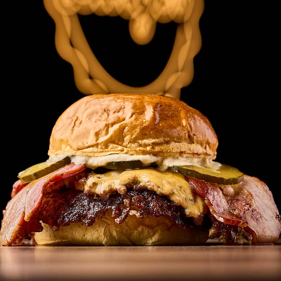 Smash burger, queso cheddar ahumado, bacon, salsa emmy, aros de cebolla, pepinillos y salsa burger.